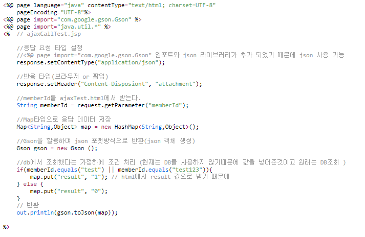 마찬가지로 JSON형식을 사용하여 데이터를 JSP로 넘긴다.