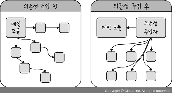 (그림 1)처럼 메인 모듈이 직접 하위 모듈에 대한 의존성을 주입 하기 보다는 (그림 2)처럼 중간에 의존성 주입자(Dependency Injector)가 이 부분을 담당하여 간접적으로 의존성을 주입하는 방식