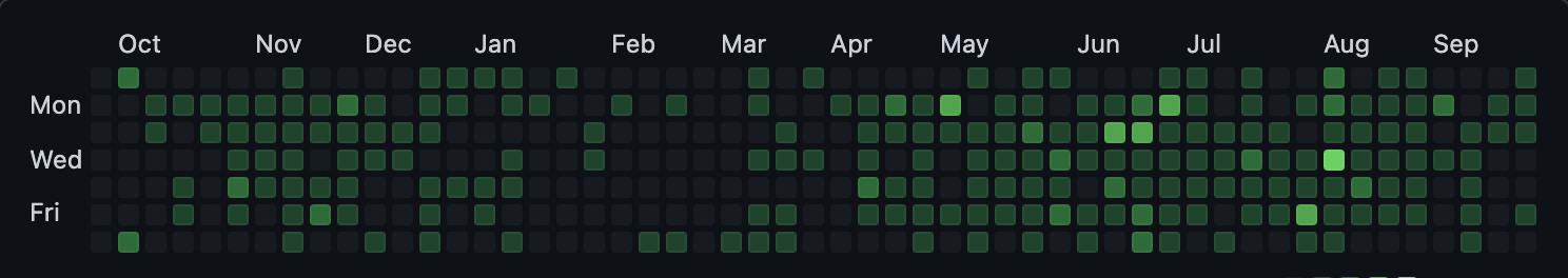 10월 1일 오늘 날짜로 지금 회사에 입사한지 1년이 되었다. 시간이 어떻게 갔는지 모를 정도로 빨리 지나갔네.. 입사하면서 정한 목표가 뭐였는지 다시 읽어 볼까.. 음.. 목표는 따로 정해두지 않았구나 단지 올 한 해의 목표??? 목표로 5개를 잡았는데 지켜진게 하나도 없구나...ㅎㅎㅎㅎ 그래도 마냥 놀지는 않았다. 1년동안 업무 보면서 꾸준히 공부는 하고 있었다. 다른 달에 비해 2월에 잔디가 없는데, 이때 뭔가 많이 복잡했다. 회사 생활하면서 이게 맞나 싶기도 하고 1 일 1 커밋을 해볼까 했는데 하루에 무조건 커밋을 해야한다는 압박감 때문에 정말 의미없는 커밋이 쌓이는거 같아서 이런식으로 커밋을 할꺼면 하지 말자 라는 생각이 들었다... 그래서 3월 초쯤까지??? 편하게 지내다가 이러면 안되겠다 ..